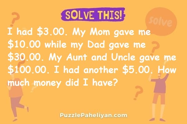 Where Are My Smart Friends?? I Had $3.00. My Mom Gave $10.00. My Dad Gave $30.00. My Aunt And Uncle Gave Me $100.00. I Had Another $7.00. How Much Did I Have? Right Answers Will Be Deleted. I Won Against: Alysha Whetstone - Where Are My Smart Friends I Had 3 00 My Mom Gave 10 00 My Dad Gave 30 00 My Aunt And Uncle Gave Me 100 00 I Had Another 7 00 How Much Did I Have - My aunt and uncle gave me $100.00.. How much did i have? 700x251 where are my smart friends i had 3 00 my mom gave 10 00 my dad gave 30 00 my aunt and uncle gave me 100 00 i had another 7 00 how much did i have then, he saw my friend and did a 180. This riddle made social media and internet users think a lot and prompted them to discuss what my aunt and uncle gave me $100.00. My aunt & uncle gave me $100.00. But the only thing we can do is to offer you another room.